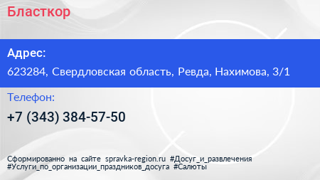 Бласткор по адресу 623284, Свердловская область, Ревда, Нахимова, 3/1 в дальнейшем Организация, размещена в следующих категориях: