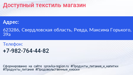 Доступный текстиль, магазин по адресу 623286, Свердловская область, Ревда, Максима Горького, 39а в дальнейшем Организация, размещена в следующих категориях: