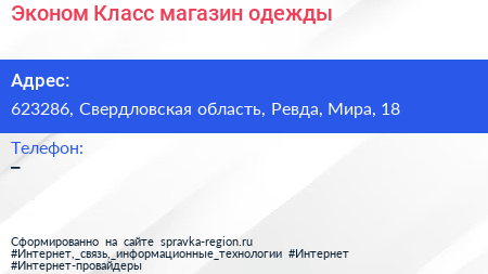 Эконом Класс, магазин одежды по адресу 623286, Свердловская область, Ревда, Мира, 18 в дальнейшем Организация, размещена в следующих категориях: