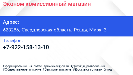 Эконом, комиссионный магазин по адресу 623286, Свердловская область, Ревда, Мира, 3 в дальнейшем Организация, размещена в следующих категориях: