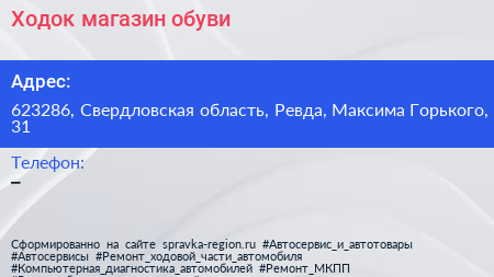 Ходок, магазин обуви по адресу 623286, Свердловская область, Ревда, Максима Горького, 31 в дальнейшем Организация, размещена в следующих категориях: