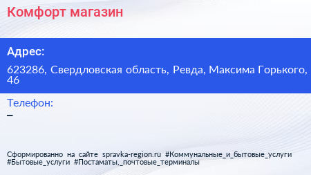 Комфорт, магазин по адресу 623286, Свердловская область, Ревда, Максима Горького, 46 в дальнейшем Организация, размещена в следующих категориях:
