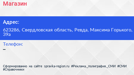 Магазин по адресу 623286, Свердловская область, Ревда, Максима Горького, 39а в дальнейшем Организация, размещена в следующих категориях: