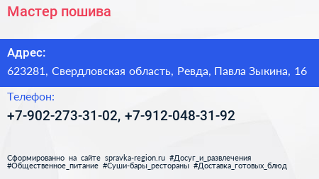 Мастер пошива по адресу 623281, Свердловская область, Ревда, Павла Зыкина, 16 в дальнейшем Организация, размещена в следующих категориях: