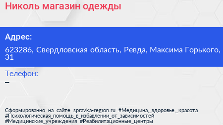 Николь, магазин одежды по адресу 623286, Свердловская область, Ревда, Максима Горького, 31 в дальнейшем Организация, размещена в следующих категориях: