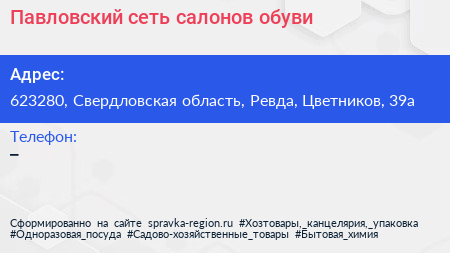 Павловский, сеть салонов обуви по адресу 623280, Свердловская область, Ревда, Цветников, 39а в дальнейшем Организация, размещена в следующих категориях: