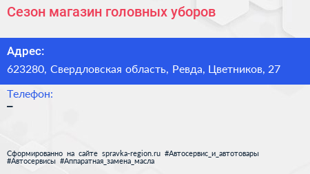 Сезон, магазин головных уборов по адресу 623280, Свердловская область, Ревда, Цветников, 27 в дальнейшем Организация, размещена в следующих категориях: