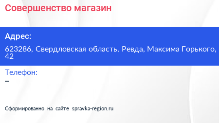Совершенство, магазин по адресу 623286, Свердловская область, Ревда, Максима Горького, 42 в дальнейшем Организация, размещена в следующих категориях: