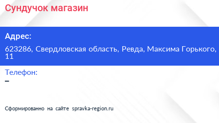 Сундучок, магазин по адресу 623286, Свердловская область, Ревда, Максима Горького, 11 в дальнейшем Организация, размещена в следующих категориях: