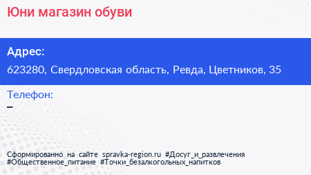 Юни, магазин обуви по адресу 623280, Свердловская область, Ревда, Цветников, 35 в дальнейшем Организация, размещена в следующих категориях: