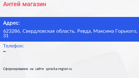 Антей, магазин по адресу 623286, Свердловская область, Ревда, Максима Горького, 31 в дальнейшем Организация, размещена в следующих категориях: