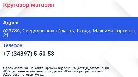 Кругозор, магазин по адресу 623286, Свердловская область, Ревда, Максима Горького, 21 в дальнейшем Организация, размещена в следующих категориях: