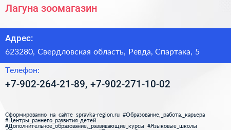 Лагуна, зоомагазин по адресу 623280, Свердловская область, Ревда, Спартака, 5 в дальнейшем Организация, размещена в следующих категориях: