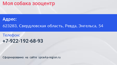 Моя собака, зооцентр по адресу 623283, Свердловская область, Ревда, Энгельса, 54 в дальнейшем Организация, размещена в следующих категориях: