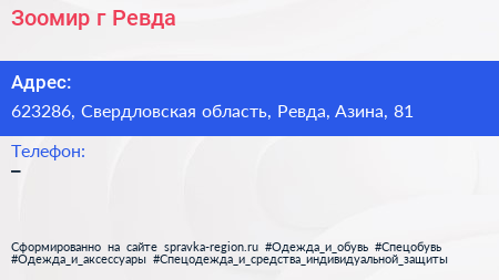 Зоомир, г. Ревда по адресу 623286, Свердловская область, Ревда, Азина, 81 в дальнейшем Организация, размещена в следующих категориях: