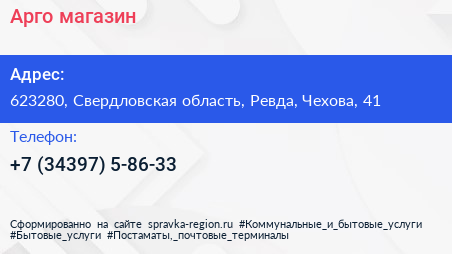 Арго, магазин по адресу 623280, Свердловская область, Ревда, Чехова, 41 в дальнейшем Организация, размещена в следующих категориях: