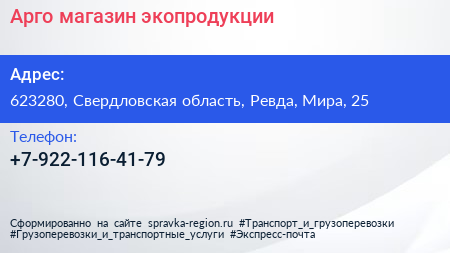 Арго, магазин экопродукции по адресу 623280, Свердловская область, Ревда, Мира, 25 в дальнейшем Организация, размещена в следующих категориях: