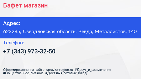 Бафет, магазин по адресу 623285, Свердловская область, Ревда, Металлистов, 140 в дальнейшем Организация, размещена в следующих категориях: