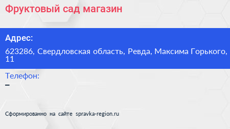 Фруктовый сад, магазин по адресу 623286, Свердловская область, Ревда, Максима Горького, 11 в дальнейшем Организация, размещена в следующих категориях: