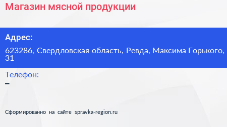 Магазин мясной продукции по адресу 623286, Свердловская область, Ревда, Максима Горького, 31 в дальнейшем Организация, размещена в следующих категориях: