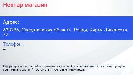Нектар, магазин по адресу 623286, Свердловская область, Ревда, Карла Либкнехта, 72 в дальнейшем Организация, размещена в следующих категориях: