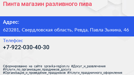 Пинта, магазин разливного пива по адресу 623281, Свердловская область, Ревда, Павла Зыкина, 46 в дальнейшем Организация, размещена в следующих категориях:
