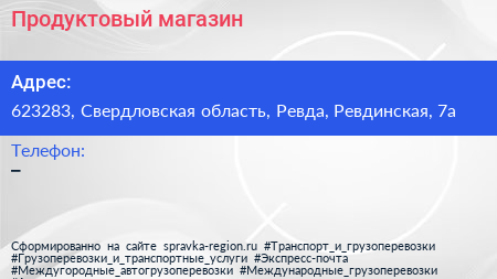 Продуктовый магазин по адресу 623283, Свердловская область, Ревда, Ревдинская, 7а в дальнейшем Организация, размещена в следующих категориях: