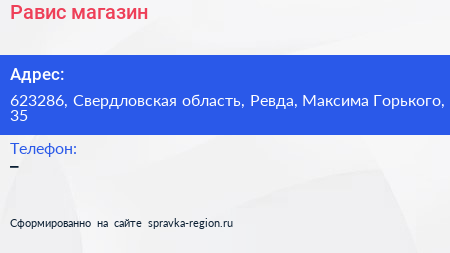 Равис, магазин по адресу 623286, Свердловская область, Ревда, Максима Горького, 35 в дальнейшем Организация, размещена в следующих категориях: