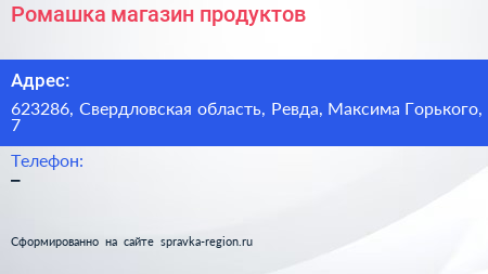 Ромашка, магазин продуктов по адресу 623286, Свердловская область, Ревда, Максима Горького, 7 в дальнейшем Организация, размещена в следующих категориях: