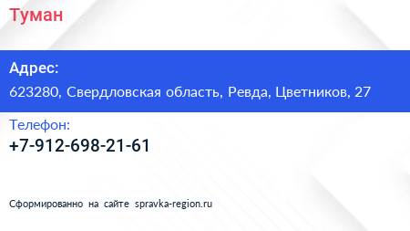 Туман по адресу 623280, Свердловская область, Ревда, Цветников, 27 в дальнейшем Организация, размещена в следующих категориях: