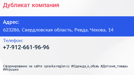 Дубликат, компания по адресу 623286, Свердловская область, Ревда, Чехова, 14 в дальнейшем Организация, размещена в следующих категориях: