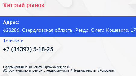 Хитрый, рынок по адресу 623286, Свердловская область, Ревда, Олега Кошевого, 17 в дальнейшем Организация, размещена в следующих категориях: