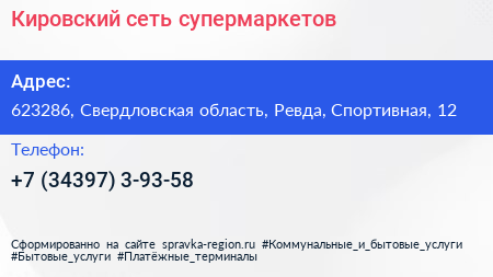 Кировский, сеть супермаркетов по адресу 623286, Свердловская область, Ревда, Спортивная, 12 в дальнейшем Организация, размещена в следующих категориях: