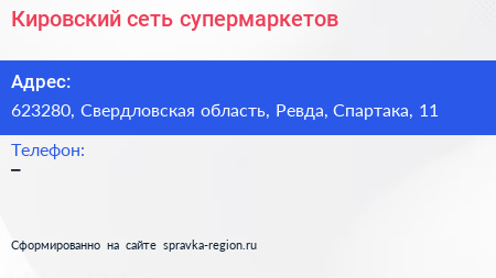 Кировский, сеть супермаркетов по адресу 623280, Свердловская область, Ревда, Спартака, 11 в дальнейшем Организация, размещена в следующих категориях: