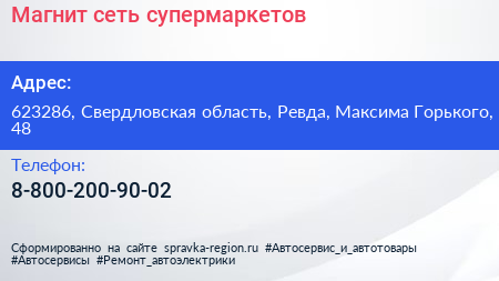 Магнит, сеть супермаркетов по адресу 623286, Свердловская область, Ревда, Максима Горького, 48 в дальнейшем Организация, размещена в следующих категориях: