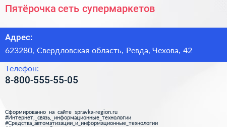 Пятёрочка, сеть супермаркетов по адресу 623280, Свердловская область, Ревда, Чехова, 42 в дальнейшем Организация, размещена в следующих категориях: