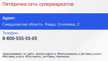 Пятёрочка, сеть супермаркетов по адресу Свердловская область, Ревда, Осипенко, 2 в дальнейшем Организация, размещена в следующих категориях: