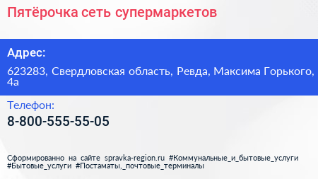 Пятёрочка, сеть супермаркетов по адресу 623283, Свердловская область, Ревда, Максима Горького, 4а в дальнейшем Организация, размещена в следующих категориях:
