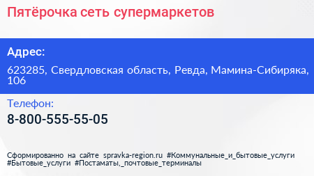 Пятёрочка, сеть супермаркетов по адресу 623285, Свердловская область, Ревда, Мамина-Сибиряка, 106 в дальнейшем Организация, размещена в следующих категориях: