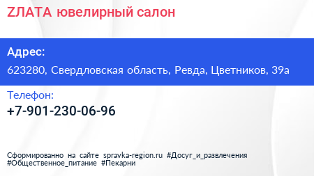 ZЛАТА, ювелирный салон по адресу 623280, Свердловская область, Ревда, Цветников, 39а в дальнейшем Организация, размещена в следующих категориях: