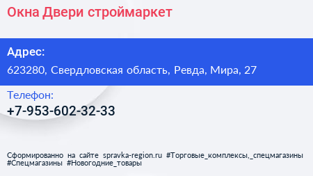 Окна & Двери, строймаркет по адресу 623280, Свердловская область, Ревда, Мира, 27 в дальнейшем Организация, размещена в следующих категориях: