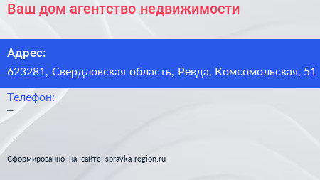 Ваш дом, агентство недвижимости по адресу 623281, Свердловская область, Ревда, Комсомольская, 51 в дальнейшем Организация, размещена в следующих категориях: