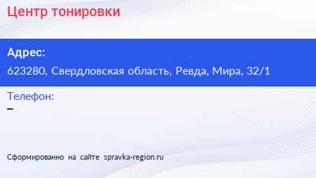 Центр тонировки по адресу 623280, Свердловская область, Ревда, Мира, 32/1 в дальнейшем Организация, размещена в следующих категориях: