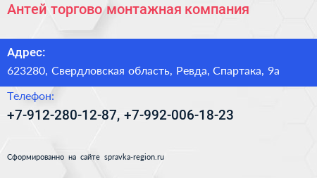 Антей, торгово-монтажная компания по адресу 623280, Свердловская область, Ревда, Спартака, 9а в дальнейшем Организация, размещена в следующих категориях: