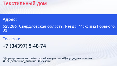 Текстильный дом по адресу 623286, Свердловская область, Ревда, Максима Горького, 31 в дальнейшем Организация, размещена в следующих категориях: