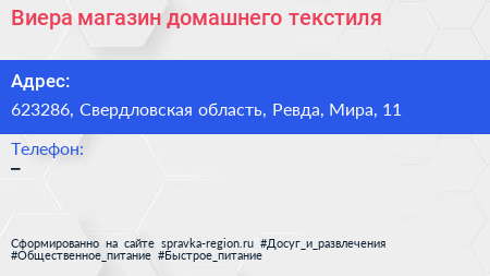 Виера, магазин домашнего текстиля по адресу 623286, Свердловская область, Ревда, Мира, 11 в дальнейшем Организация, размещена в следующих категориях: