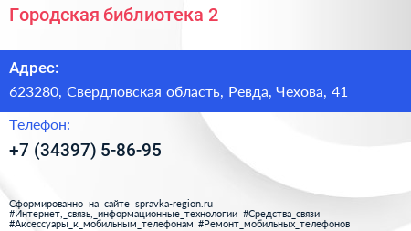 Городская библиотека №2 по адресу 623280, Свердловская область, Ревда, Чехова, 41 в дальнейшем Организация, размещена в следующих категориях: