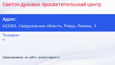 Светоч, духовно-просветительский центр по адресу 623281, Свердловская область, Ревда, Ленина, 5 в дальнейшем Организация, размещена в следующих категориях: