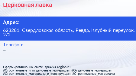 Церковная лавка по адресу 623281, Свердловская область, Ревда, Клубный переулок, 2/2 в дальнейшем Организация, размещена в следующих категориях: