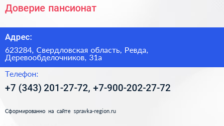 Доверие, пансионат по адресу 623284, Свердловская область, Ревда, Деревообделочников, 31а в дальнейшем Организация, размещена в следующих категориях: